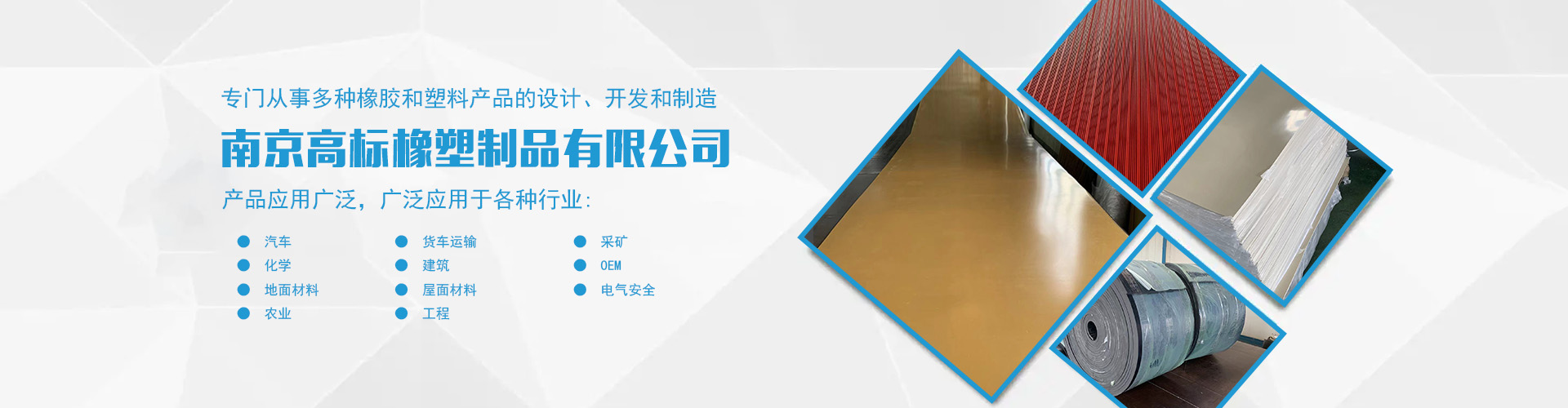 南京高标橡塑制品有限公司是一家专业的橡胶板、橡胶制品和热塑性塑料产品的制造商。主营产品:三元乙丙橡胶板,丁腈橡胶版,氯丁橡胶板,丁苯橡胶板,丁基橡胶板,天然橡胶板,硅橡胶板,氟橡胶板,绝缘,防静电,导电橡胶板,夹布,夹金属网橡胶板,耐酸碱橡胶板,耐油橡胶板,耐磨橡胶板,阻燃橡胶板,阻尼橡胶板,减震橡胶板,防滑橡胶板,橡胶垫片等。 高标橡塑专门从事多种橡胶和塑料产品的设计、开发和制造。我们的产品应用广泛。广泛应用于各种行业,包括:汽车,货车运输,采矿,化学,建筑,OEM,地面材料,屋面材料,电气安全,农业,工程等。 高标橡塑的客户服务于许多行业,包括垫片切割、分销商、工业用品零售商和批发商。自